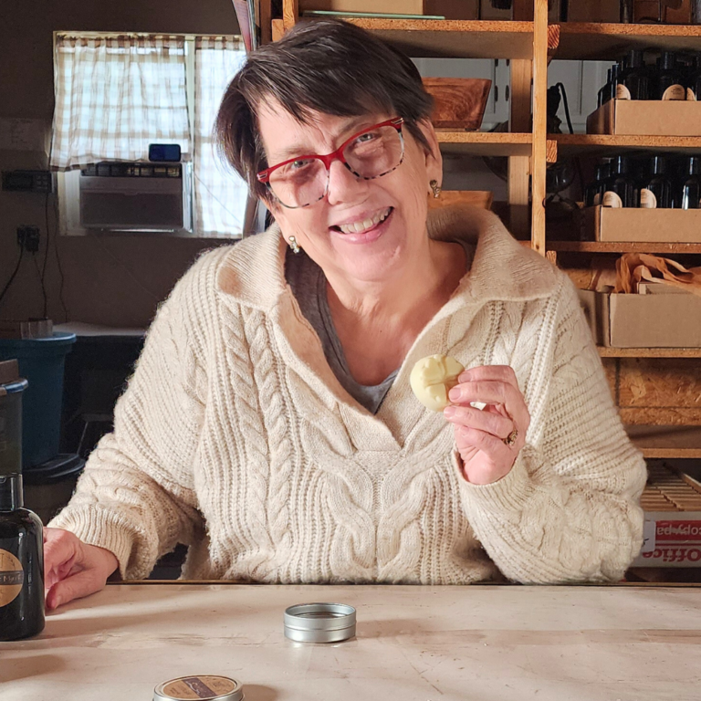 Susan Svec holding a lotion bar, an excellent barrier for dry winter skinPin